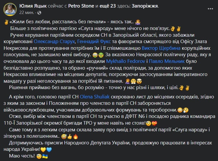 "А кроме того, председателем партии СН Аленой Шуляк направлено письмо в местные ячейки, согласно которому по закону и Положению о членстве в партии СН запрещается военнослужащим, участникам добровольческих формирований и терробороны. Так что выбор между членством в партии СН и участием в ДФТГ N6 и должностью советника командира 110-й Запорожской отдельной бригады ТРО у меня даже не стоял!", - сообщила она.