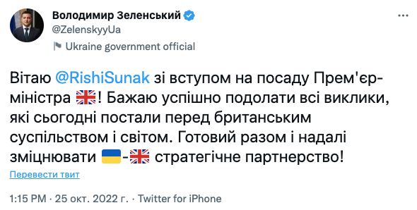 19.43 Риши Сунак впервые в должности премьера Великобритании прокомментировал российско-украинскую войну.