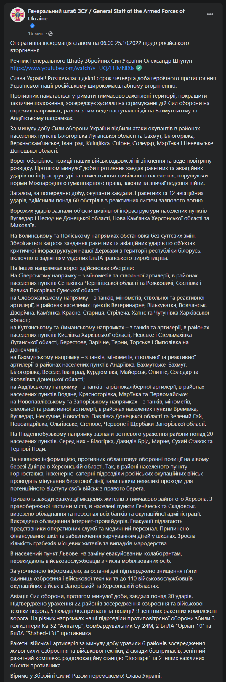 Утром во вторник 25 октября, Генштаб ВСУ опубликовал актуальную сводку с фронта. Сообщается, что за минувшие сутки ВСУ отразили атаки противника в районах населенных пунктов Белогоровка (Луганской области), Бахмут, Белогоровка, Верхнекаменское, Иванград, Клещеевка, Спорное, Соледар, Марьинка и Невельское (Донецкой области). Это направления Северска, Бахмута и территорий к западу от Донецка - Авдеевки и Марьинки.