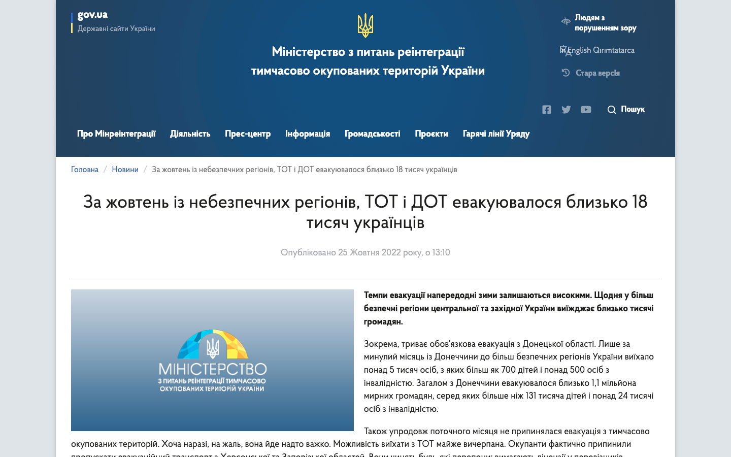 В течение октября уже 18 тысяч украинцев были эвакуированы из оккупированных и прифронтовых территорий.