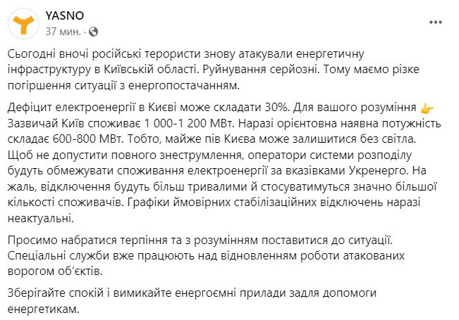 Об этом говорится на странице энергопоставщика Yasno в Facebook.