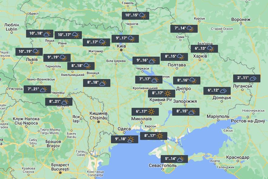 Во Львове в субботу ночью +10°, днем +19°, облачно с прояснениями. В воскресенье ночью +9°, днем +14°, пасмурно, сплошная облачность, дождь.
