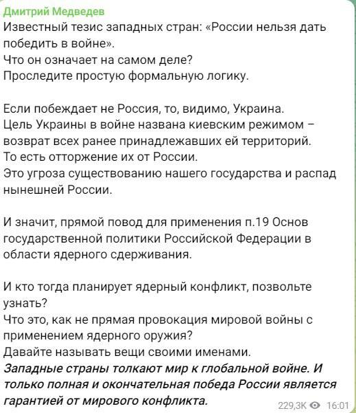 "Если побеждает не Россия, то, видимо, Украина. Цель Украины в войне – возврат всех ранее принадлежавших ей территорий. То есть отторжение их от России. Это угроза существованию нашего государства и распад нынешней России. И значит, прямой повод для применения п.19 Основ государственной политики Российской Федерации в области ядерного сдерживания", - заявил Медведев.