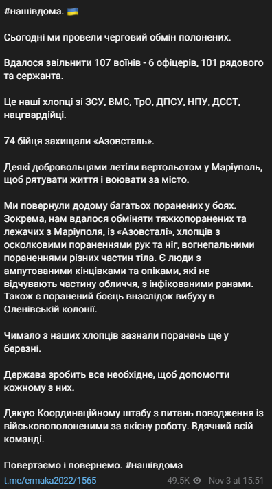 "Мы вернули домой многих раненых в боях. В частности, нам удалось обменять тяжелораненых и лежащих из Мариуполя, из "Азовстали", ребят с осколочными ранениями рук и ног, огнестрельными ранениями разных частей тела.
