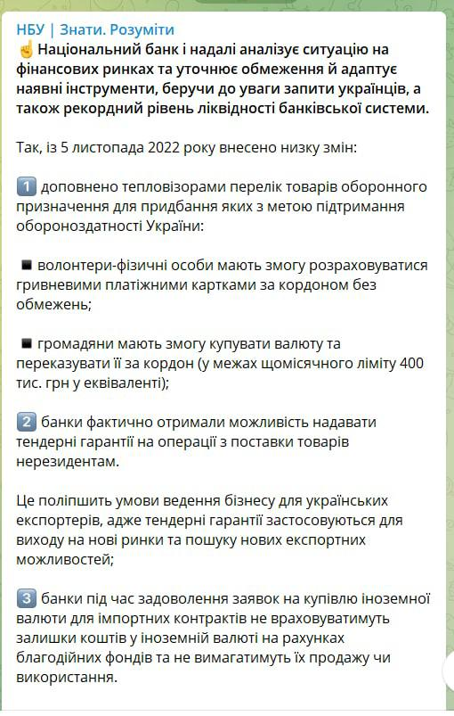 С 5 ноября 2022 года НБУ внес изменения в порядок покупки за границей товаров для поддержки обороноспособности Украины.