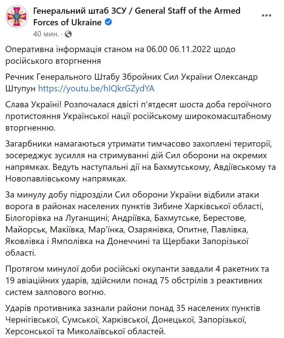 Об этом сообщается в утренней сводке Генштаба ВСУ от 6 ноября.