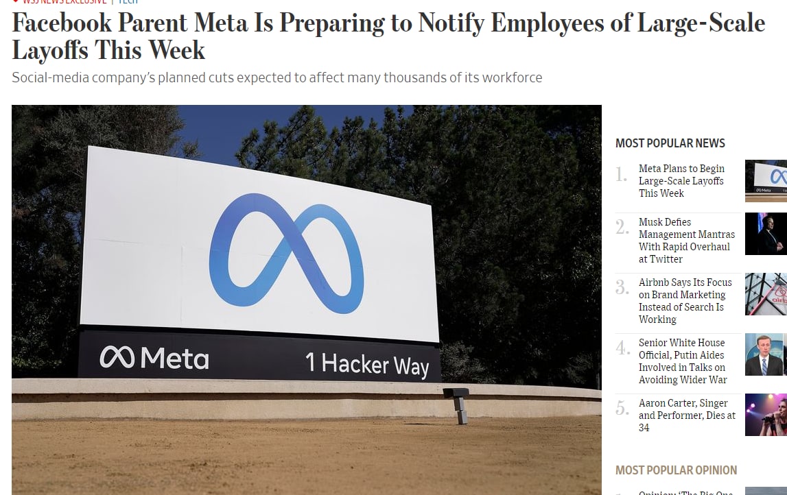 Увольнения коснутся многих тысяч сотрудников, о чем, по данным The Wall Street Journal, могут объявить уже в среду. Всего в компании Марка Цукерберга работает 87 тысяч человек.