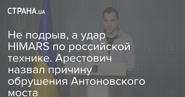 Советник главы Офиса президента Алексей Арестович заявил, что Антоновский мост в Херсоне обвалился не из-за подрыва россиян, а из-за попадания ракетами HIMARS по скоплению техники.