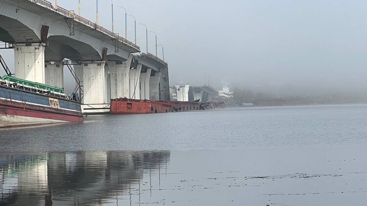 Появились утренние фото с Антоновского моста, где полностью обвалилось несколько пролетов во время отступления российских войск.