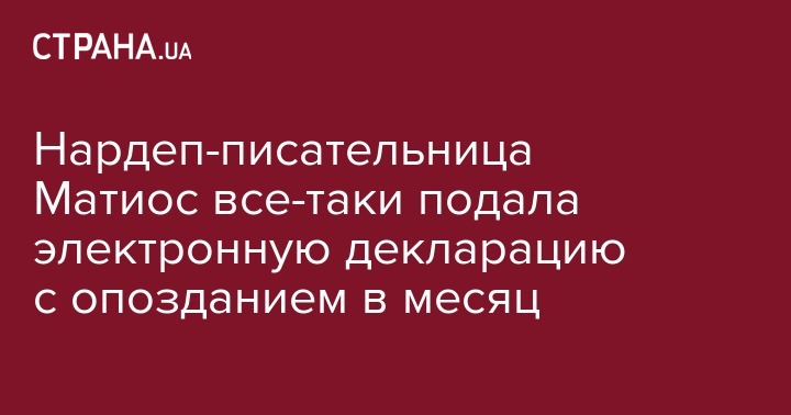 Народный депутат Мария Матиос ("БПП") опубликовала свою электронную декларацию через месяц после завершения срока подачи. Об этом говорится на сайте Единого государственного реестра электронных деклараций