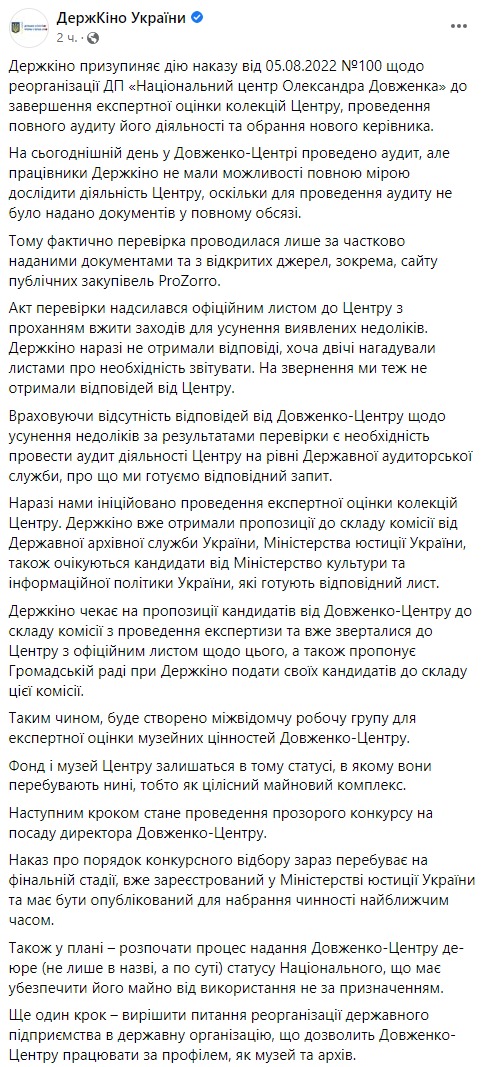 В ведомстве отмечают, что на сегодняшний день в "Довженко-Центре" проведен аудит, но работники Госкино не имели возможности в полной мере исследовать деятельность Центра, поскольку для проведения аудита не были предоставлены документы в полном объеме, поэтому фактически проверка проводилась только по частично предоставленным документам и открытым источникам, в частности, сайту публичных закупок ProZorro.