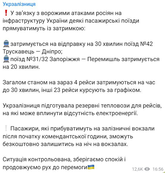 Компания "Укрзализныця" сообщает, что в связи с ударами по инфраструктуре 15 ноября опаздывают поезда: