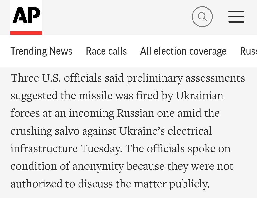 "Трое официальных лиц США заявили, что, по предварительным оценкам, ракета была выпущена украинскими войсками по приближающейся российской ракете во время сокрушительного залпа по электроинфраструктуре Украины во вторник.