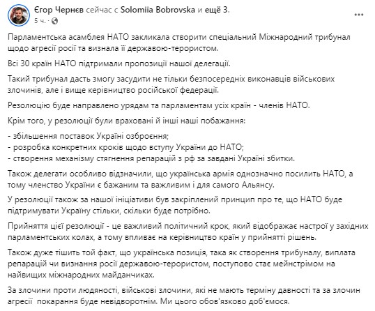 Об этом написал депутат от "Слуги народа", глава Постоянной делегации Украины в Парламентской Ассамблее НАТО Егор Чернев на своей странице в Facebook.