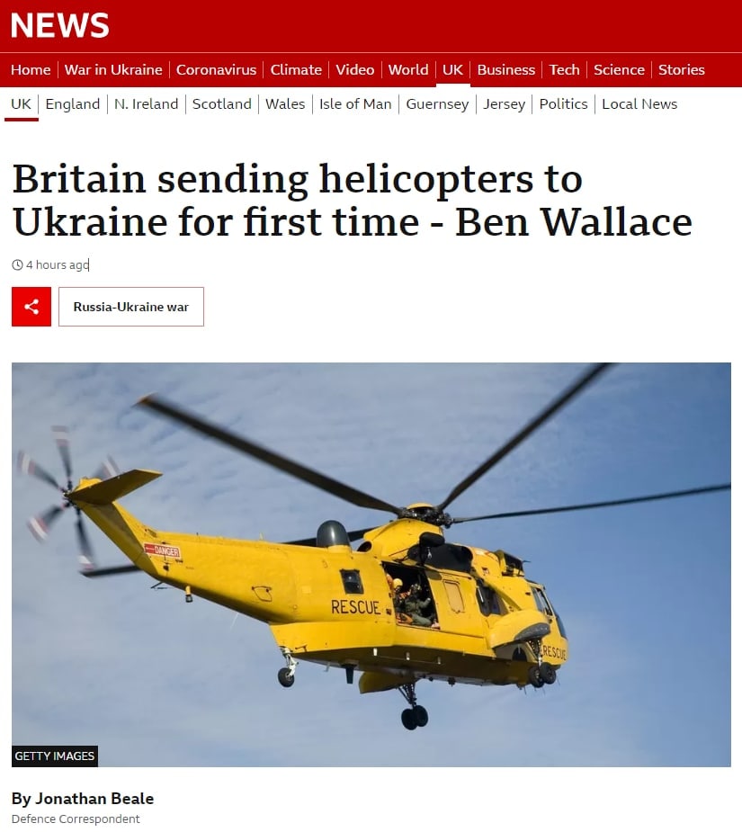 Британия, которая отправила Украине половину запаса NLAW, передаст еще три вертолета Sea King и десять тысяч артиллерийских снарядов.