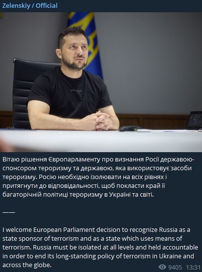 "Россию необходимо изолировать на всех уровнях и привлечь к ответственности, чтобы положить конец ее многолетней политике терроризма в Украине и мире", - написал он в телеграм-канале.