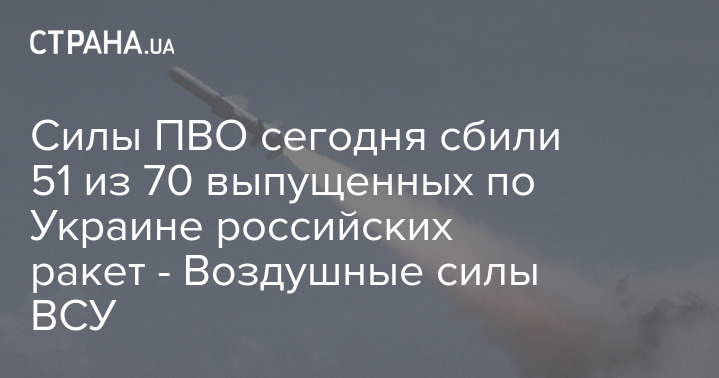 Командование Воздушных сил ВСУ сообщает, что сегодня силами ПВО была сбита 51 из 70 ракет, выпущенных по Украине, и 5 дронов-камикадзе.