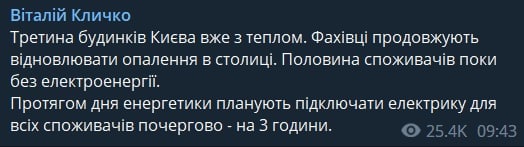 09.48 Треть Киева уже с теплом. Специалисты продолжают заниматься восстановлением, сообщил мэр Кличко.