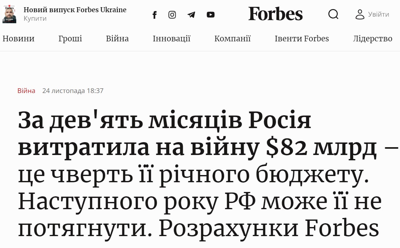 10.48 Расходы РФ на войну против Украины составили уже более 80 млрд долларов, то есть - четверть российского бюджета, пишет Forbes.