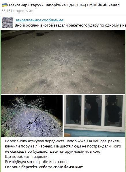06.10 Ночью под удар РФ попало предместье Запорожья. Пострадала больница. В ней вылетели окна. Люди - не пострадали.