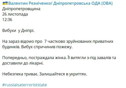 12.44 Глава Днепровской ОВА Резниченко говорит о 7 разрушенных частных жилых домах после сегодняшних ракетных ударов.