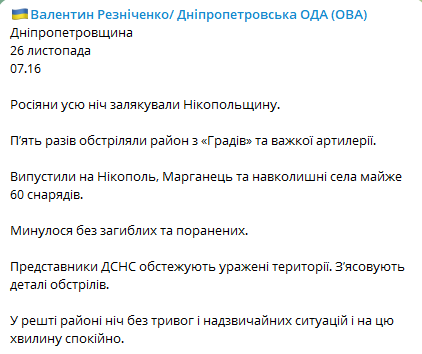 Как писала "Страна", 21 ноября российские войска обстреляли из "Градов" и артиллерии Днепропетровскую область, ранив мужчину в Никополе.