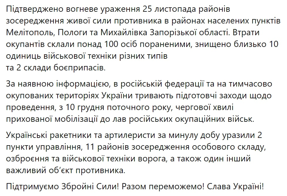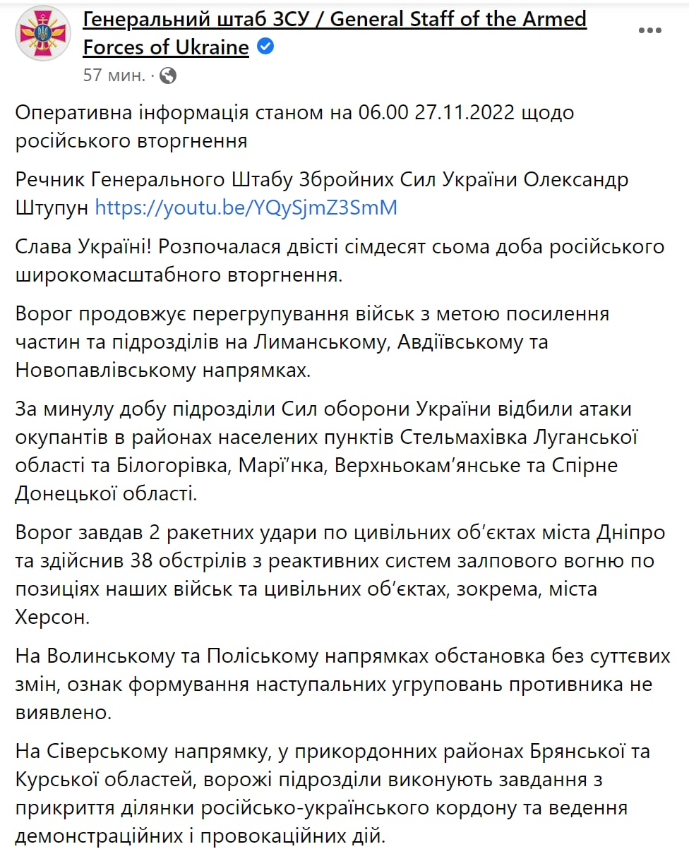 В воскресенье утром, 27 ноября, Генштаб Вооруженных сил Украины опубликовал свежую сводку. Главное из утренней сводки Генштаба: