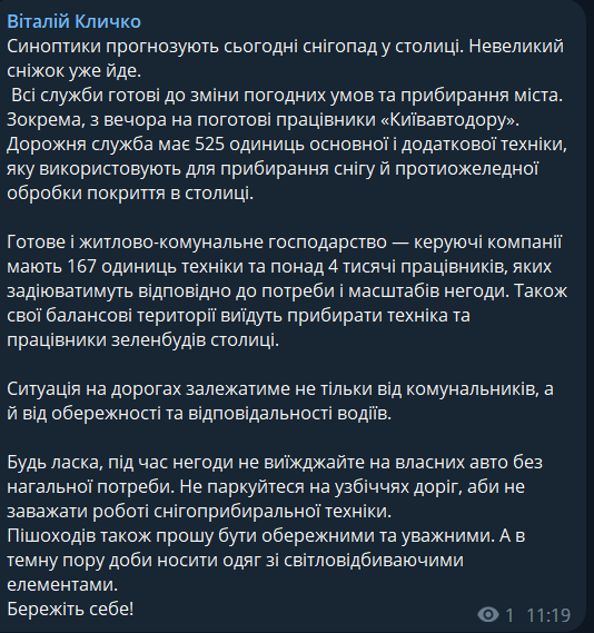 Об этом в своем телеграм-канале написал мэр столицы Виталий Кличко.