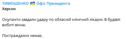 Пострадавших нет, сообщил заместитель руководителя Офиса президента Кирилл Тимошенко в своем телеграм-канале.