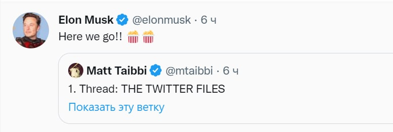 Накануне вечером эти разоблачения анонсировал владелец Твиттера Илон Маск. Позже он дал ссылку на посты журналиста Мэтта Тайбби с подписью "Ну, поехали!".