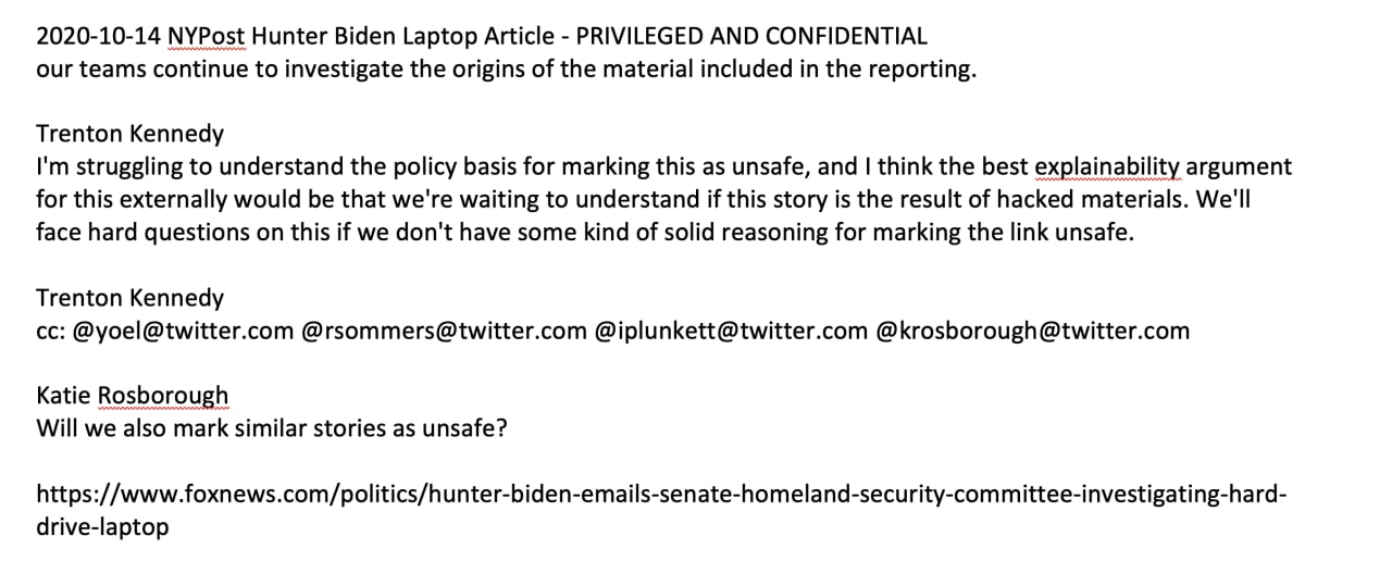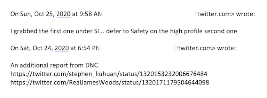 В частности, есть скриншот переписки между работниками Твиттера, один из которых присылает ряд ссылок на посты "от команды Байдена". В ответном письме сотрудник соцсети сообщал: "Обработано" (видимо, контент был удален).