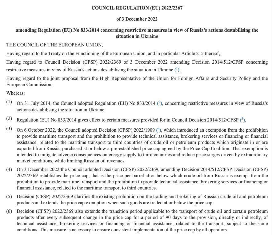 12:20 Евросоюз опубликовал в своем официальном сетевом журнале принятое накануне решение о введении потолка цен на российскую нефть и нефтепродукты. Его также поддержала группа G7 и Австралия.