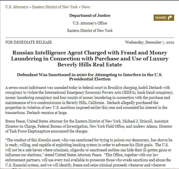 Прокуратура Восточного округа Нью-Йорка заочно предъявила обвинения в отмывании денег депутату Верховной Рады Украины III—IX созывов Андрею Деркачу.