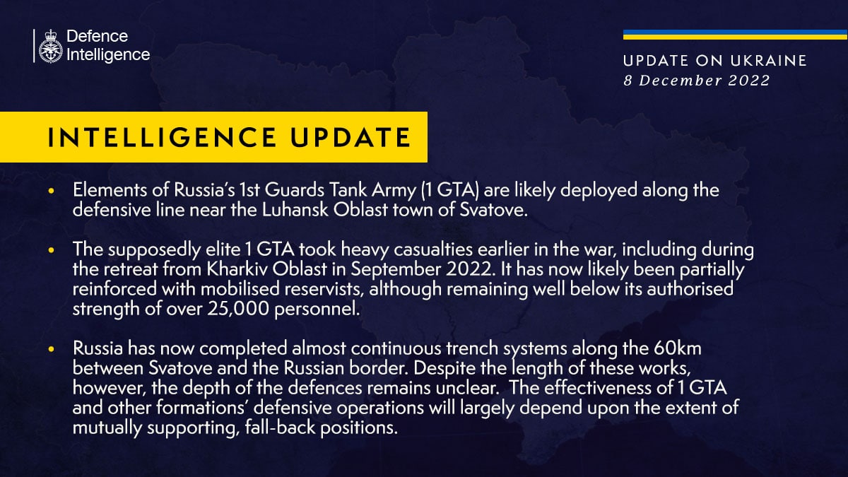 Вдоль российской линии обороны в районе Сватово, по данным британской разведки, дислоцированы подразделения 1-й гвардейской танковой армии РФ.