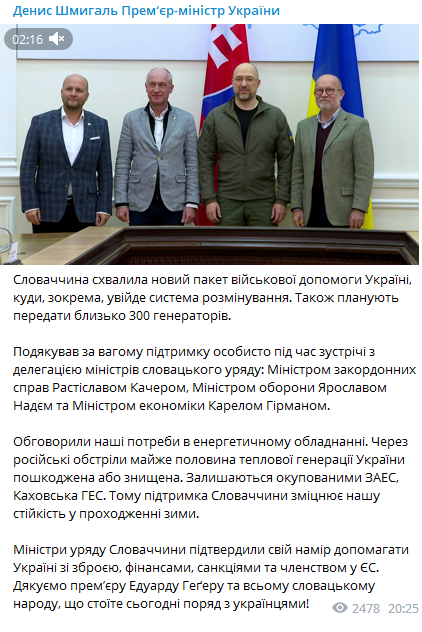 Об этом сообщил премьер Денис Шмыгаль в своем телеграм-канале по итогам встречи с делегацией министров словацкого правительства.