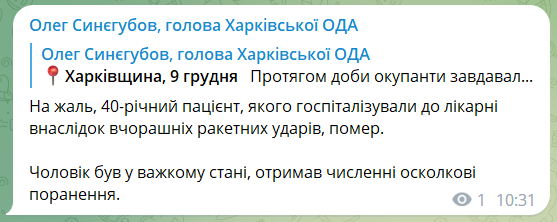 Позже Синегубов уточнил, что 40-летний пациент, раненный в результате ударов россиян, скончался в больнице.