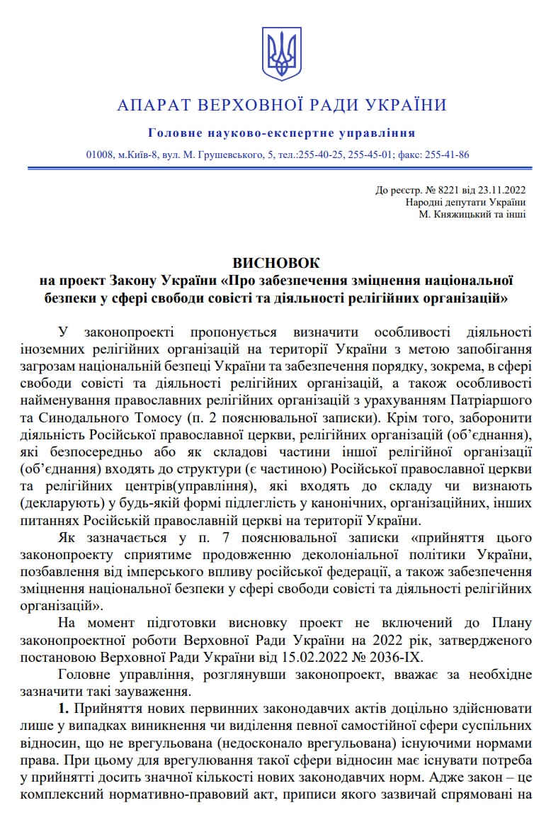"По нашему мнению, сейчас такое предложение законопроекта может повлечь за собой существенное религиозное напряжение в обществе среди верующих, ведь по состоянию на 01.01.2021 количество религиозных организаций Украинской православной церкви, которой проект Закона может касаться, составляет 12 406, что составляет почти 62% среди общего количества 19 860 православных религиозных организаций в Украине. Вокруг вопроса, который предлагается урегулировать в законопроекте, длительное время ведется дискуссии в обществе. 24.02.2022 Россия начала полномасштабную войну против Украины. Активизация в столь сложный период дискуссионных инициатив ослабляет необходимую консолидацию общества", - заключает управление.