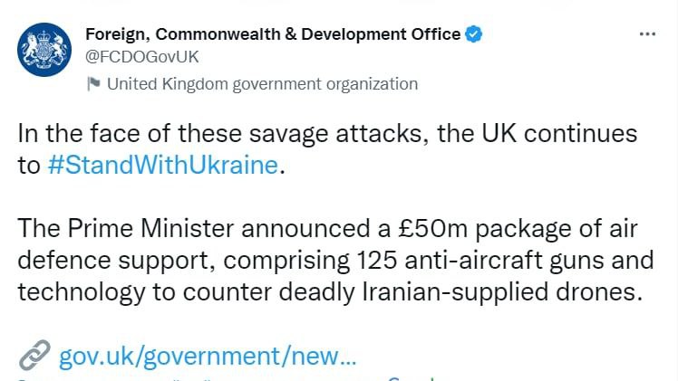 Великобритания передаст Украине новый пакет военной помощи на £50 миллионов. В него войдут 125 зенитных пушек