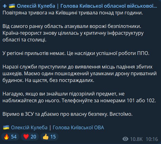 7:43 Губернатор Кулеба подтвердил атаку "Шахидов" на Киевскую область и заявил, что большинство из них сбито.