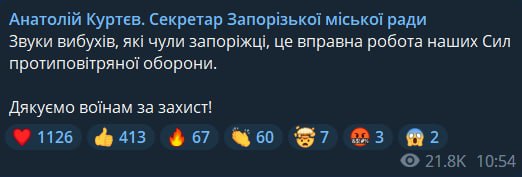 11.10 Звуки взрывов, которые слышали в Запорожье - результат работы ПВО, сообщил секретарь горсовета Запорожья Анатолий Куртев.