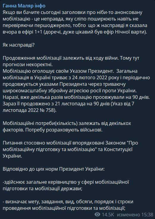 13.10 В Украине возможна новая волна мобилизации, заявила замминистра обороны Анна Маляр.