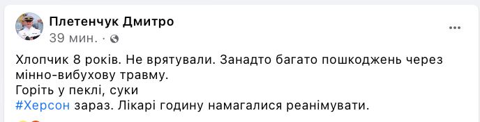 «Врачи в течение часа пытались реанимировать мальчика. К сожалению, полученные ранения оказались несовместимы с жизнью», – написал глава Херсонской ОВА.