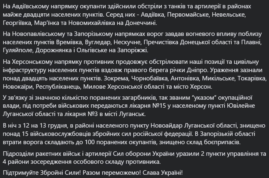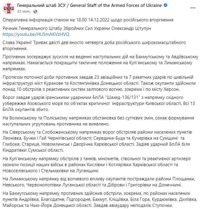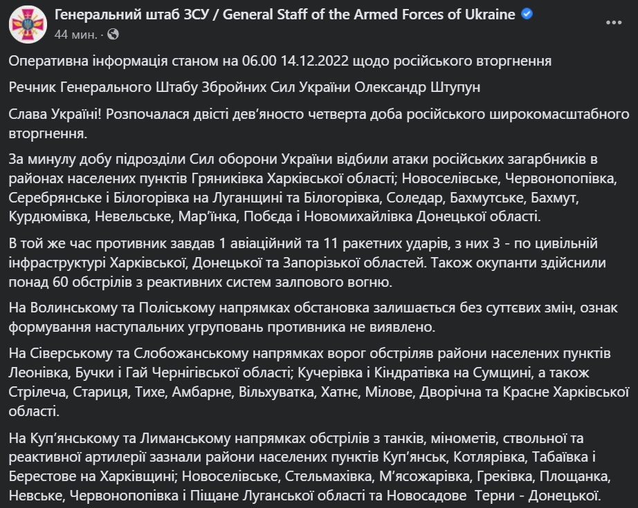 Во среду, 14 декабря, в Украине идет уже 294-й день войны с РФ.