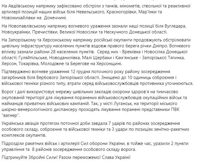 4. Подтверждено поражение 12 декабря района сосредоточения армии РФ возле Вербового Запорожской области. Уничтожены до 10 единиц вооружения и военной техники разного типа, потери среди военнослужащих уточняются.