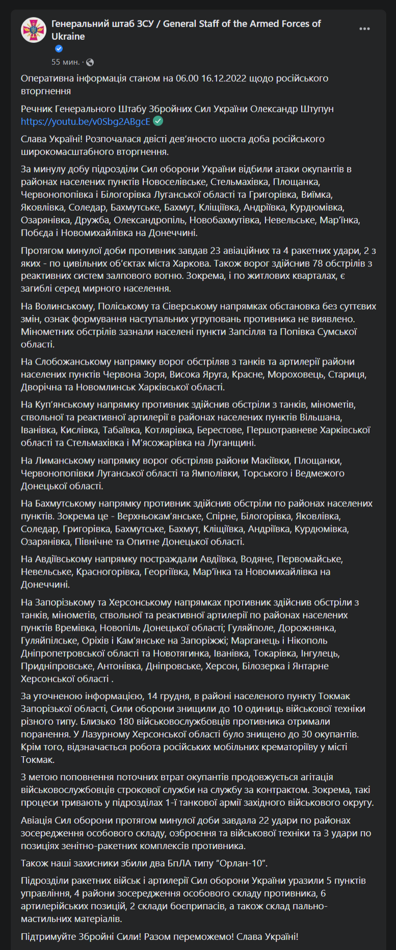 В пятницу, 16 декабря, в Украине идет уже 296-й день войны с РФ.