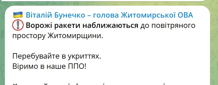 08:17 Губернатор Житомирской области Бунечко пишет об угрозе массированного ракетного удара.