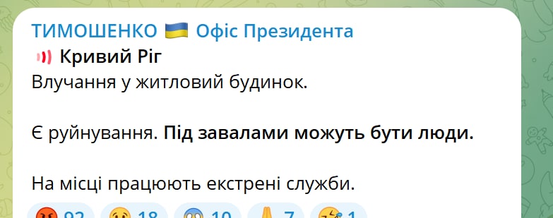 09:40 В Кривом Роге попадание по жилому дому, сообщили в Офисе президента. Под завалами могут быть люди.