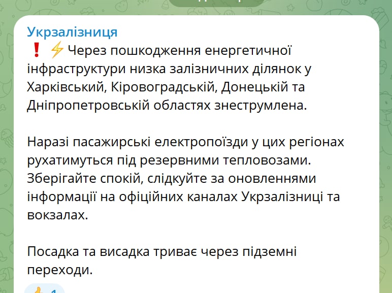 09:42 Ряд участков железной дороги обесточены из-за российских ударов по объектам энергетики, сообщает "Укрзализныця".
