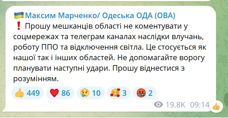 09:09 В ряде областей есть прилеты по объектам энергетической инфраструктуры. Об этом заявил одесский губернатор Марченко.