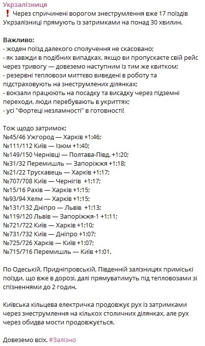 Кроме того, "Укрзализныця" сообщает, что вокзалы работают на посадку и высадку через подземные переходы, люди находятся в укрытиях.